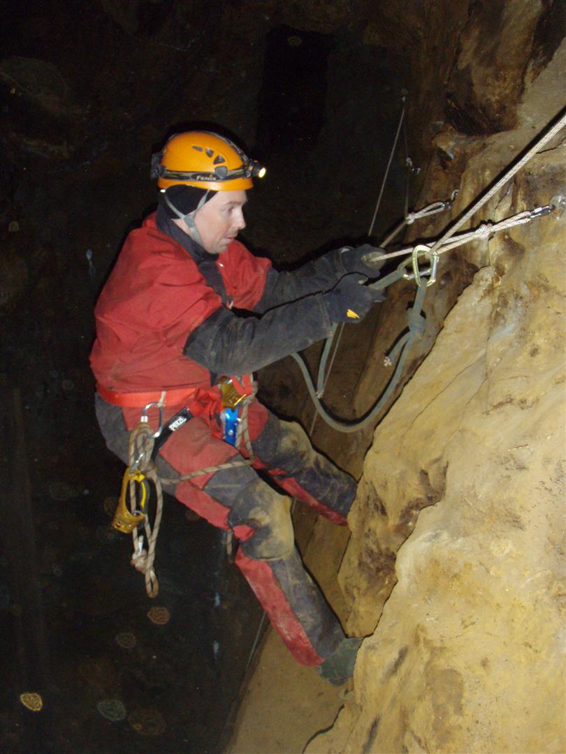 Ralf hämmästelee pultin ohitusta poikkikulussa Klevan kaivoksessa, Ruotsissa.