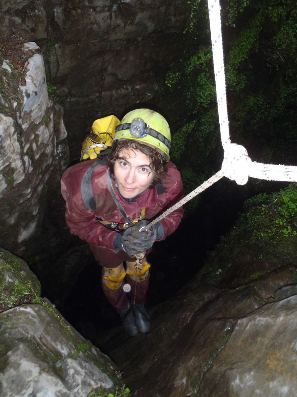 Velma köysinousee ylös leveästä kuilusta päivänvaloon. Pant Mawr Pot, Etelä-Wales.